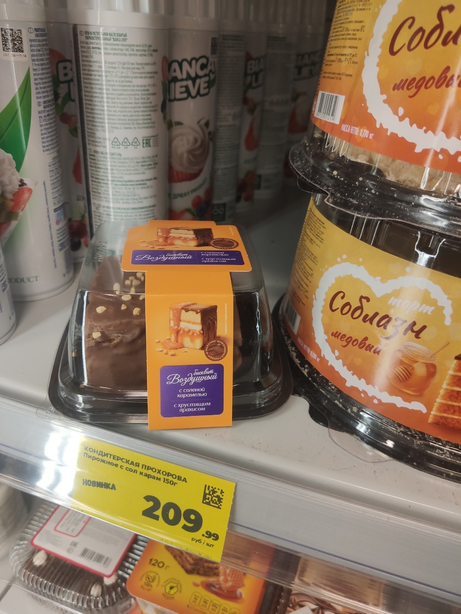 Довелось, значит, мне побывать в "Магните", где я планировала потратить от силы 200 рублей, т.к. дома не хватало исключительно хлеба и молока, но, как и ведается, когда совершенно не ждешь новинок, они поджидают на каждом шагу. И ведь посетила-то я самый обычный супермаркет, не заходила ни в какой большой магазин, где изначально предполагается расширенный ассортимент, а, значит, это отличный повод поделиться находками и с вами. Не выбирала ничего по своему вкусу и не старалась собрать подборку исключительно из тех продуктов, что стоило бы покупать каждый день, поэтому обзор будет довольно разношерстным, но, надеюсь, каждый присмотрит для себя что-то интересное. С отзывами пока тоже трудновато, скупать все подряд возможности нет, но хотя бы первыми впечатлениями поделюсь и от самих новинок, и от ценников на них. Начнем сразу с десертов, а то как же не порадовать себя каким-нибудь тортиком или пирожным? Особенно если они так красиво выглядят уже на полке. Не понравилась цена в 209 рубл