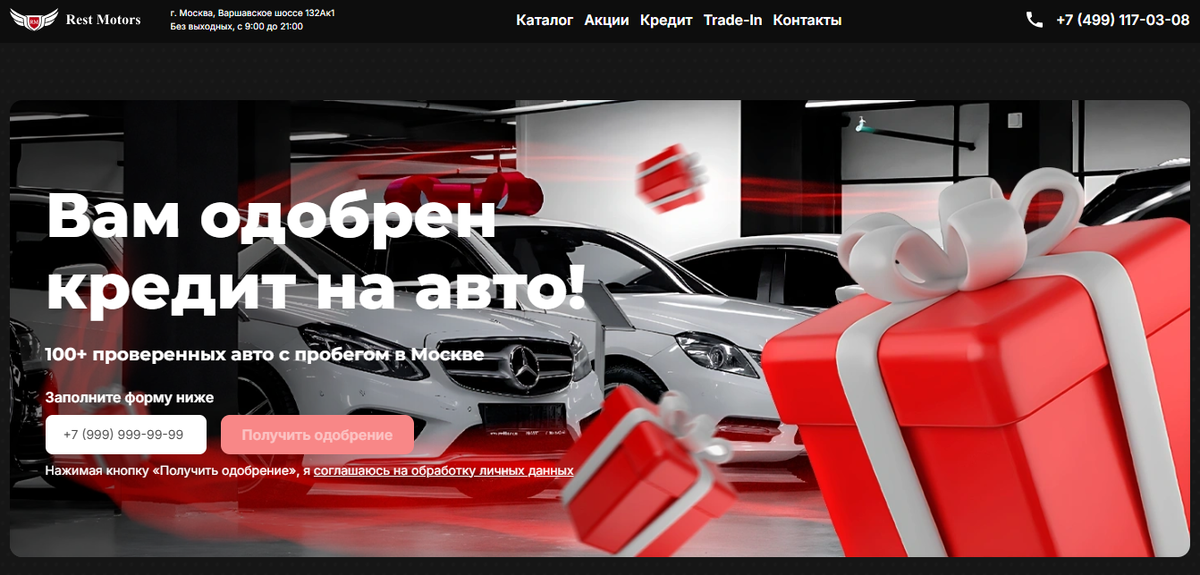 Rest Motors — это автосалон в Москве. Занимается продажей подержанных автомобилей. Ценовое и кредитное предложения кажутся подозрительными. Больше интересного — в нашем обзоре. Справка об автосалоне, информация о владельце и проверка по судебным базам Адрес: Москва, Варшавское шоссе 132А к1 Сайт: rest-motors.ru Тип: мультибрендовый салон, серый дилер Направление работы: продажа автомобилей с пробегом В автосалоне на Варшавском шоссе 132А к1 в Москве можно купить автомобиль с пробегом. В онлайн-каталоге представлено большое количество марок, однако достоверных сведений о наличии на сайте нет. Также кажется подозрительным отсутствие верифицированных отчётов о состоянии ТС с пробегом. Кроме того, настораживают кредитные условия: разбег ставки от 4,9% до 90%. Учитывая размер ключевой ставки, первая цифра не выглядит правдоподобно. Пугает момент, что дилер, выступая в качестве кредитного брокера, допускает ставку в 90%. Информация о владельце Владельцем автоцентра Rest Motors является ОО