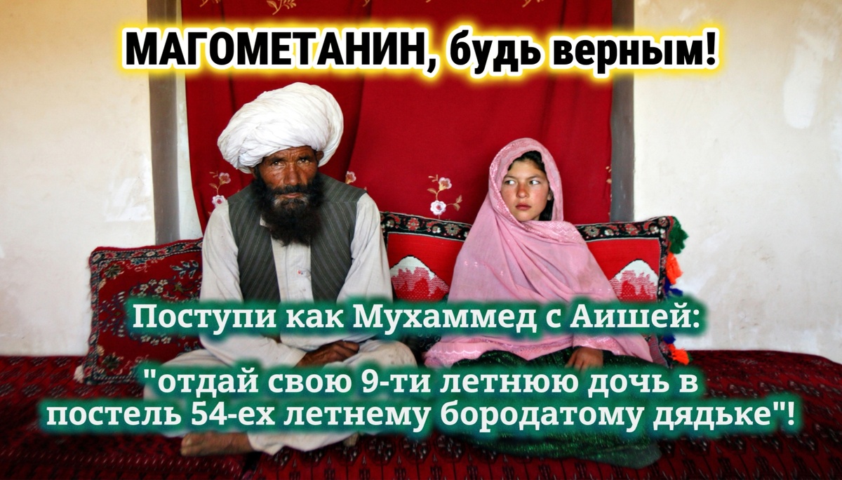 Лжепророк мухаммед в 54 года, имея много жён решил позабавиться с маленькой девочкой. В 6 лет он посватался, а в 9 лет женился на девочке Аише. Вот такая вот "арабская история" для юных девочек и стареньких бородатых дяденек, почти что 1001 ночь с 9-ти летней Шахиризадой (Аишей) Хадисы о возрасте Аиши В двух наиболее надежных суннитских сборниках хадисов, принадлежащих аль-Бухари и Имаму Муслиму, говорится, что Аише было 6 или 7 лет на момент помолвки и 9 лет на момент заключения брака. То же самое передает Ибн Саад. Ибн Хишам говорит о 9 или 10 годах: "Передано Аишей: Пророк взял меня в жены, когда мне было шесть (лет)... Затем она доверила меня им, и они подготовили меня (к свадьбе). Неожиданно Посланник Аллаха пришел ко мне утром, и моя мать отдала меня ему. В то время мне было девять лет". (Сахих аль-Бухари 5:58:234) Также хадис из Сахих Муслим (Сборник хадисов Имама Муслима): "Мой брачный договор с Пророком, да благословит его Аллах и приветствует, был заключён, когда я