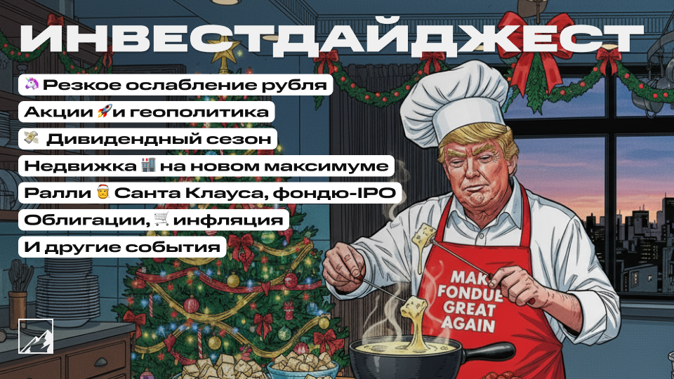 Финишная прямая, до Нового Года всего 2 недели и одно заседание ЦБ по ключу — каким он будет, скоро узнаем. А вот что уже знаем, так это про дивиденды, новости по мирному плану и космические цены в недвижке! Кроме того, Базис срубил на фондю-IPO 3 млрд рублей — красавчики. И вы уж тем более красавчики, ловите свежий дайджест. Это легендарный еженедельный дайджест, который выходит в моём телеграм-канале, на который приглашаю обязательно подписаться, чтобы ничего не пропускать, там много топового контента. Подписывайтесь и на мой канал в Дзене тоже! Тут новые публикации выходят раньше всего, и вы ничего не пропустите! 🏆 Резкое ослабление рубля Наконец-то эксперты оказались правы;) Изменение за неделю: 76,50 → 80,05 ₽ за доллар (курс ЦБ 76,09 → 79,72). Юань 11,78 → 11,23 (ЦБ 10,73 → 11,27). Похоже, экспортёры продали валюту. Импортёры начали её активнее покупать. Что говорят эксперты? Опрошенные ЦБ аналитики ожидают в декабре около ₽81 за доллар В компании Эйлер ждут ₽85 на конец февр