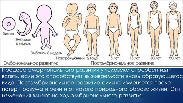 u Процесс эмбрионального развития у человека способен идти вспять, если это способствует выживаемости вновь образующегося вида. Постэмбриональное развитие сильно изменяется после потери разума и речи и от нового природного образа жизни. Эти изменения влияют на ход эмбрионального развития. Голландский анатом Луи Больк в свое время высказал идею, что человек и позвоночные в результате эволюции теряли взрослые черты и приобретали признаки характерные для младенцев. Эти предполагаемые изменения Больк назвал неотенией и педоморфозом. На самом деле, в результате биологической инволюции бывшего человека происходит не неотения и педоморфоз, как предполагал Л. Больк, а взрослая форма теряет присущую человеку дефинитивную функцию. Взрослый человек, потеряв разум и речь, приобретает адаптации к природному образу жизни, например, к древолазанию. Он становится похож на обезьяну. (Обезьяны многократно происходили от бывшего человека.) Более ранние стадии развития (детеныши) сохраняют присущую чел