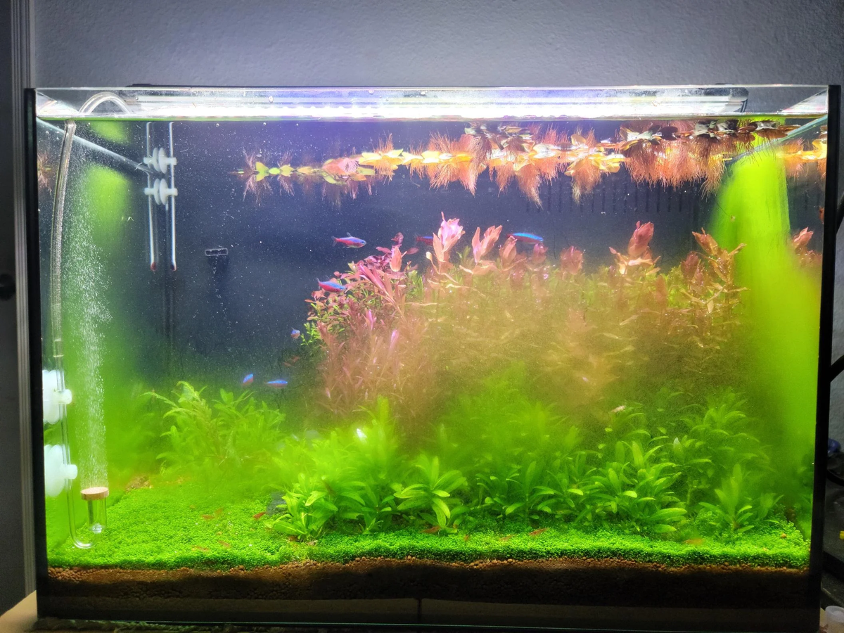 Причина: Органическая грязь в воде (перекорм, перенаселение, редкие уборки), нестабильный уровень CO2, сильное течение. Часто появляется после покупки новых растений.