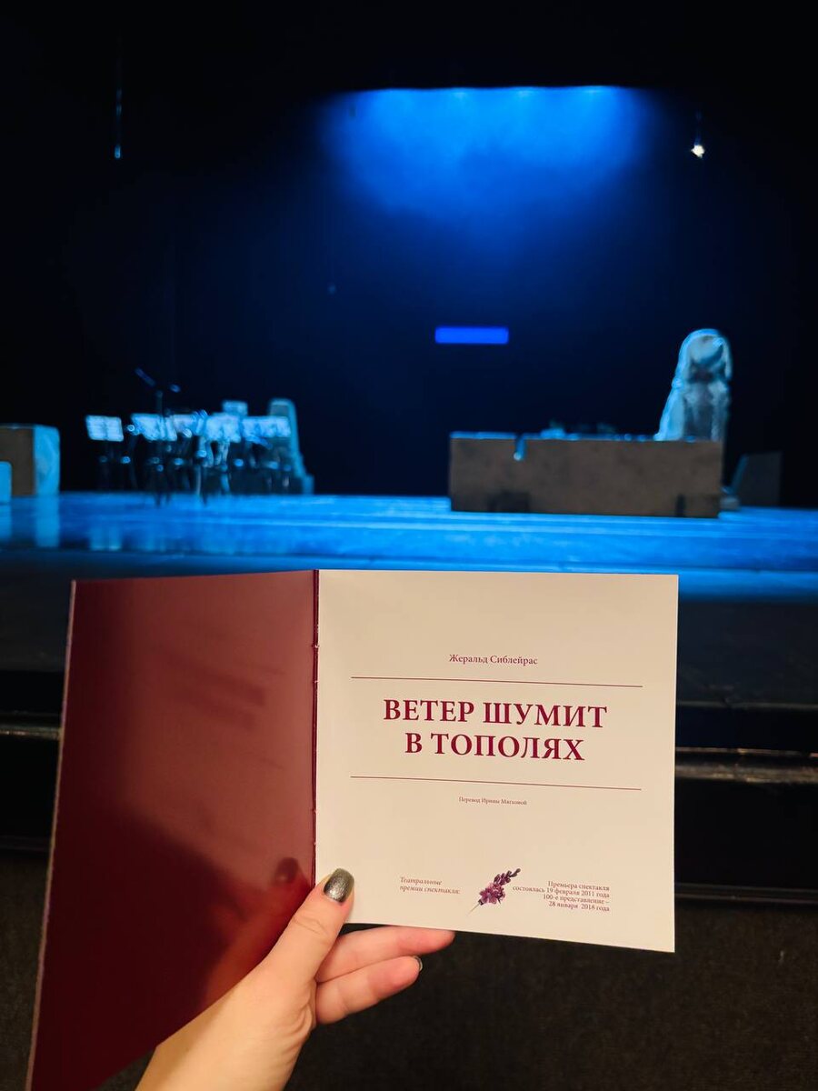 На «Ветер шумит в тополях» я давно хотела попасть, но, увы раньше так и не сложилось. В основе постановки – пьеса французского драматурга Жеральда Сиблейраса «Ветер в тополях». Она рассказывает о 3 стариках, ветеранах Первой мировой войны, проживающих в доме престарелых. Педант Рене, у которого деревянный протез вместо одной ноги, обитает тут уже 20 лет; Фернан, контуженный в голову немецким снарядом, у которого постоянно случаются обмороки, - 10 лет; и неврастеник Густав, у которого предположительно психологические расстройства, меньше всех – всего 6 месяцев, но уже мечтающий сбежать из этого места. Каждый день старики встречаются на террасе и, ввиду большой разницы характеров, постоянно спорят, отпускают колкие замечания и совершают эксцентричные поступки. Но как-то уже и не могут друг без друга, и, главное, в один день их объединяет общий план – сбежать отсюда на высокий холм, к тополям, которые виднеются издалека.