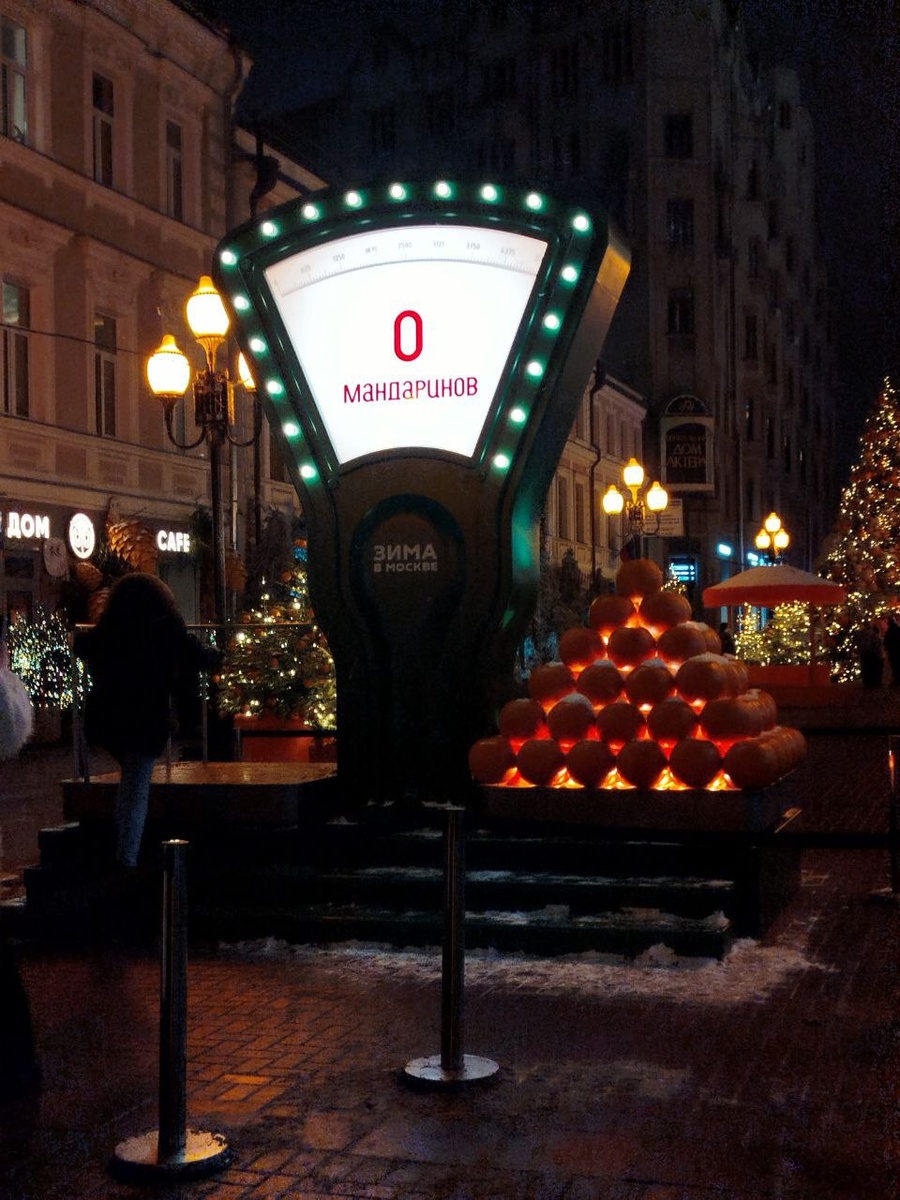 На Арбате (Москва) весы ⚖️ показывающие эквивалент массы человека в мандаринах 🍊
