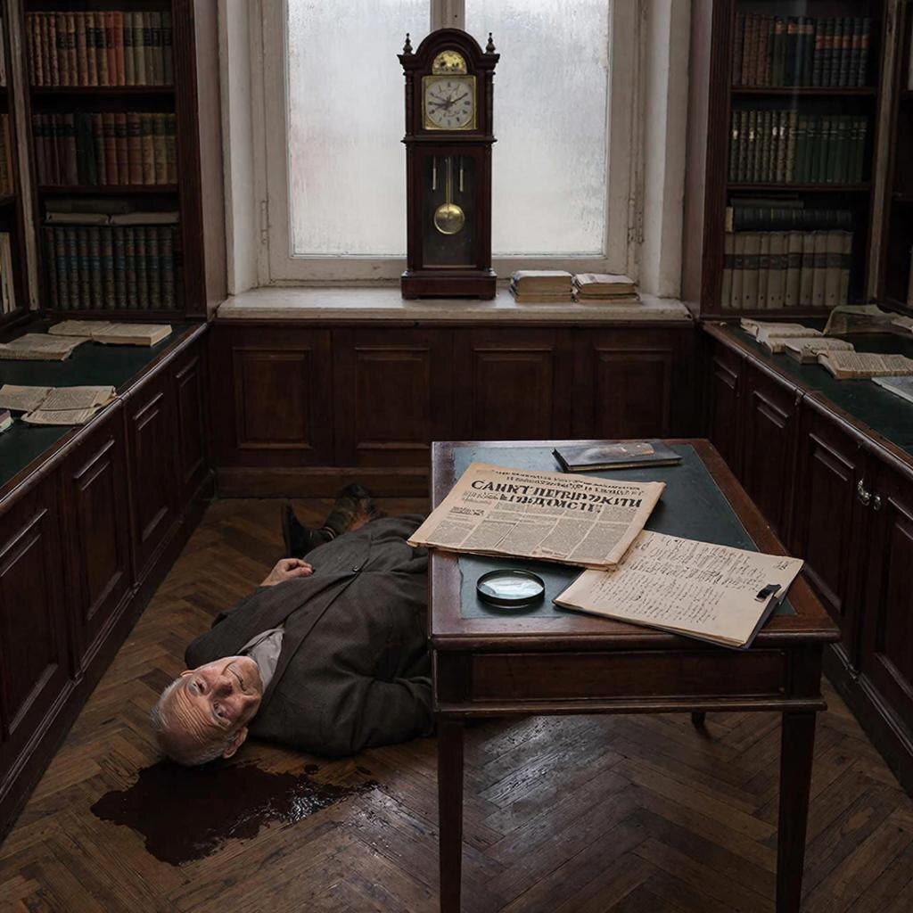 На темном паркетном полу, рядом с опрокинутым тяжелым деревянным стулом, лежал мужчина. Лицом вниз. Возле его головы темнело пятно. На столе перед пустым креслом был аккуратно разложен подшитый том газеты «Санкт-Петербургские ведомости» за 1913 год, лупа и блокнот с записями. На единственном в кабинете окне с матовым стеклом мерно тикали старинные библиотечные часы в деревянном корпусе.