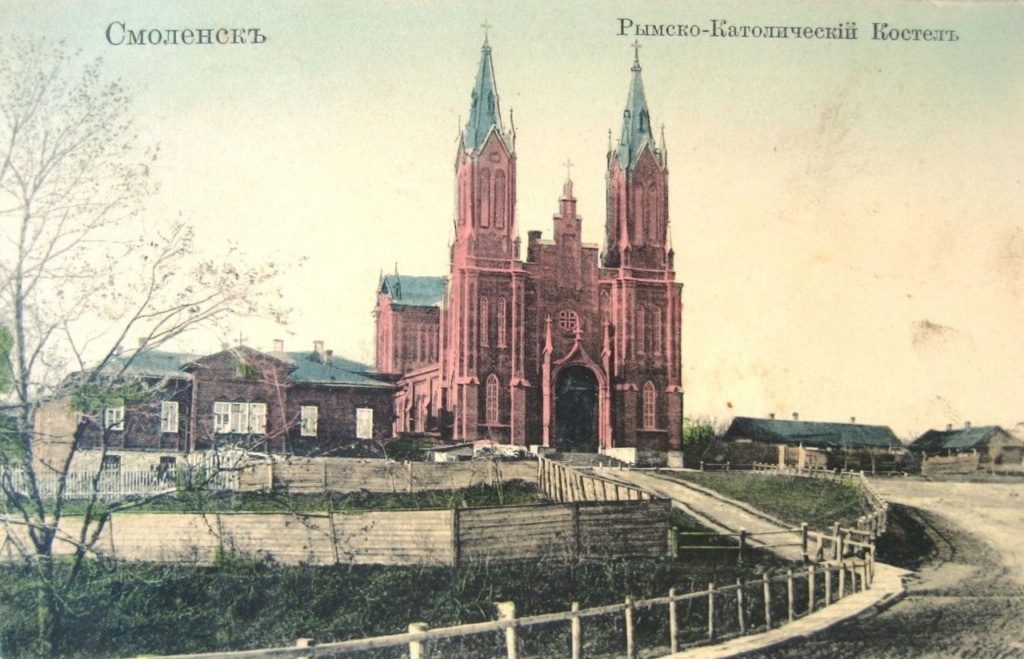 В конце XIX века на Костельной улице в центре Смоленска началось строительство большого католического храма, так как предыдущий, освященный во имя Рождества Пресвятой Богородицы, перестал вмещать всех прихожан. Архитектурный проект костела последовательно создавали М.Ф. Мейшнер, М.М. Мейшнер и Е.Ф. Лыщинский. В 1898 году строительство было завершено. Оконные витражи для новой церкви были изготовлены в мастерской графини Марии Магдалины Лубенской в Варшаве, а росписи создал варшавский живописец Антоний Точинский. Звонница церкви Непорочного Зачатия имела пять колоколов, самые тяжелые из которых: «св. Николай», «св. Петр» и «Матерь Божья Ченстоховская», - имели вес соответственно 640, 320 и 160 килограммов. После революции католическая община Смоленска начала медленно исчезать. Сначала с храма сняли колокола, в 1936 году арестовали настоятеля, после чего богослужения в костеле прекратились. С 1940 года в здании располагался архив НКВД, а позднее оно было передано под фондохранилище Го