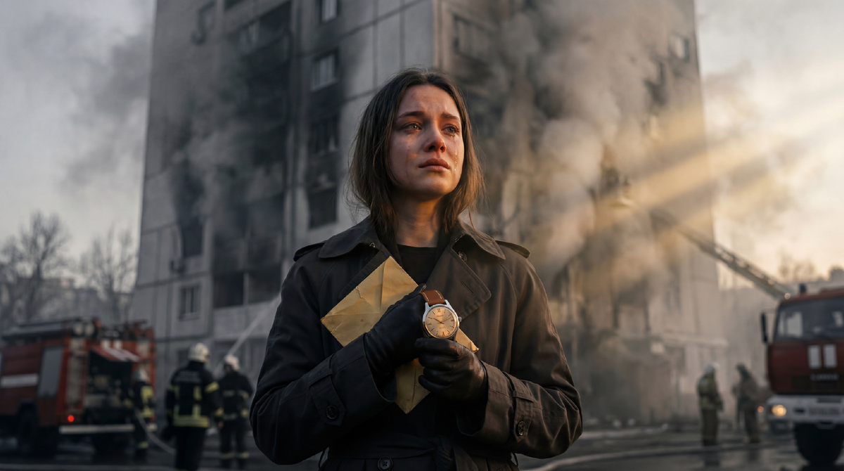 За спиной дымилось здание. Пожарные сворачивали шланги. Утреннее солнце пробивалось сквозь дым. Золотое. Тёплое. Живое.