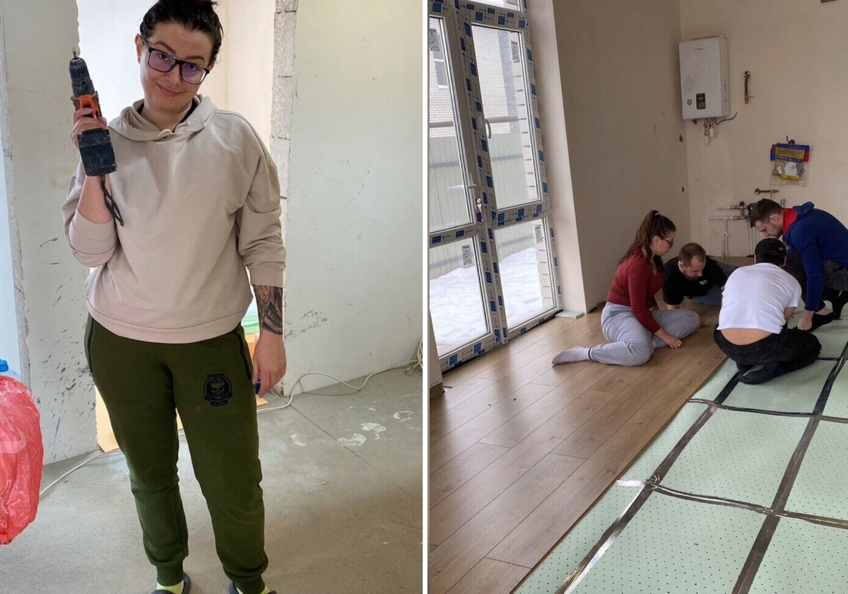 Хозяйку этого сканди-дома зовут Дарья Хилько. Здесь она живет вдвоем со своей любимой собакой по кличке Буцефал. Дарья купила дом в ипотеку, почти все накопленные деньги отдала на первый взнос. Поэтому ремонт делала поэтапно из бюджетных материалов. На момент покупки коттедж представлял собой бетонную коробку. На первом этаже пространство уже было зонировано: входная зона, кухня-гостиная, две гостевые спальни и санузел с душем. А на мансардном этаже была свободная планировка. Там Дарья сделала открытую спальню с гардеробной, рабочей зоной и отдельно стоящей ванной. Ремонт ей помогали делать родственники, друзья и даже коллеги. Например, однажды девушка пригласила коллег на корпоратив к себе домой, выдала каждому инструменты и вместе они укладывали ламинат. «Это была не только веселая корпоративная встреча, но и полезное занятие для меня», — говорит Дарья Хилько. На фото ниже: слева — Дарья, справа — тот самый корпоратив с укладкой ламината. Вот еще несколько фотографий, сделанных в пр