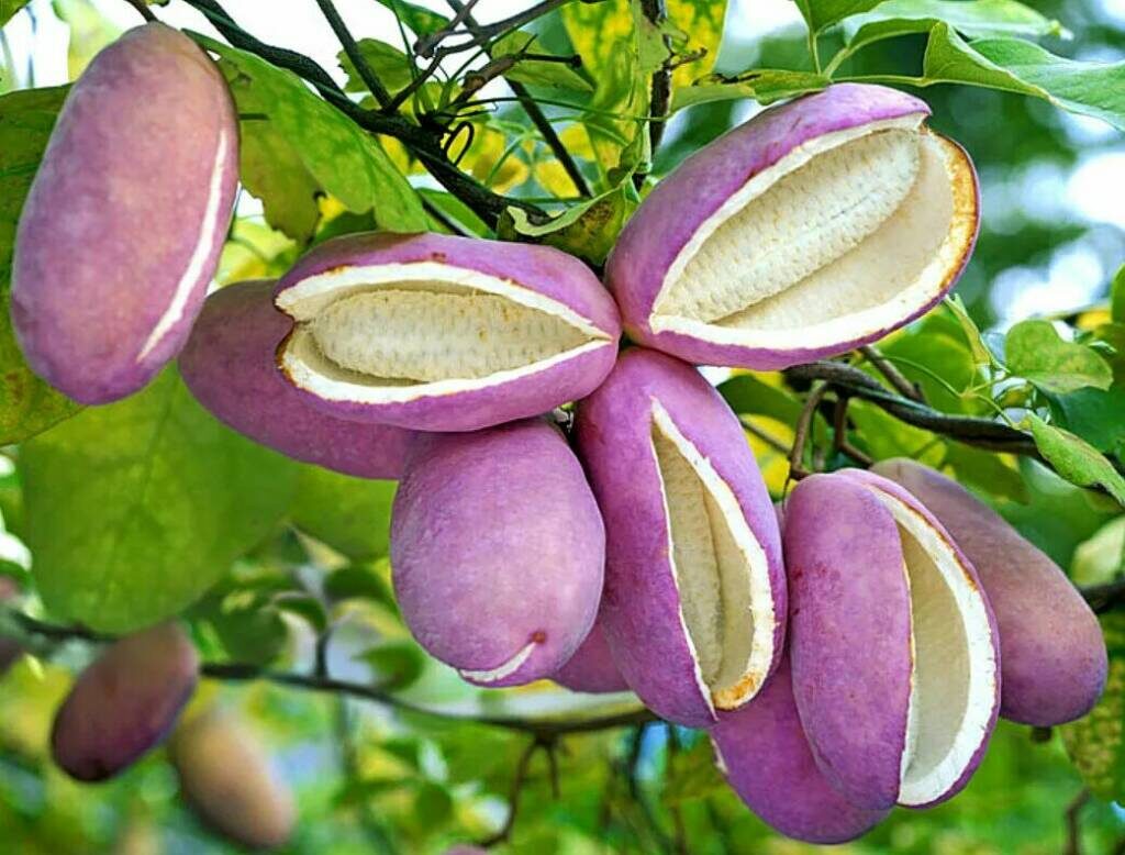 - Плоды: Самая интересная особенность акебии – ее плоды. Они представляют собой крупные, мясистые стручки, которые при созревании раскрываются, обнажая желеобразную, полупрозрачную мякоть с множеством мелких, черных семян. Мякоть имеет сладковатый вкус, который многие описывают как нечто среднее между бананом, дыней и клубникой, с легким шоколадным оттенком. Именно этот вкус и аромат дали акебии ее "шоколадные" названия. Плоды созревают осенью.
