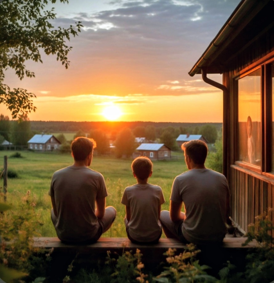 В тот вечер они сидели на крыльце: Петрович в стареньком свитере, Ральф — в простой рубашке, которую ему подарила Рита. Солнце опускалось за лес, окрашивая небо в золото и пурпур.