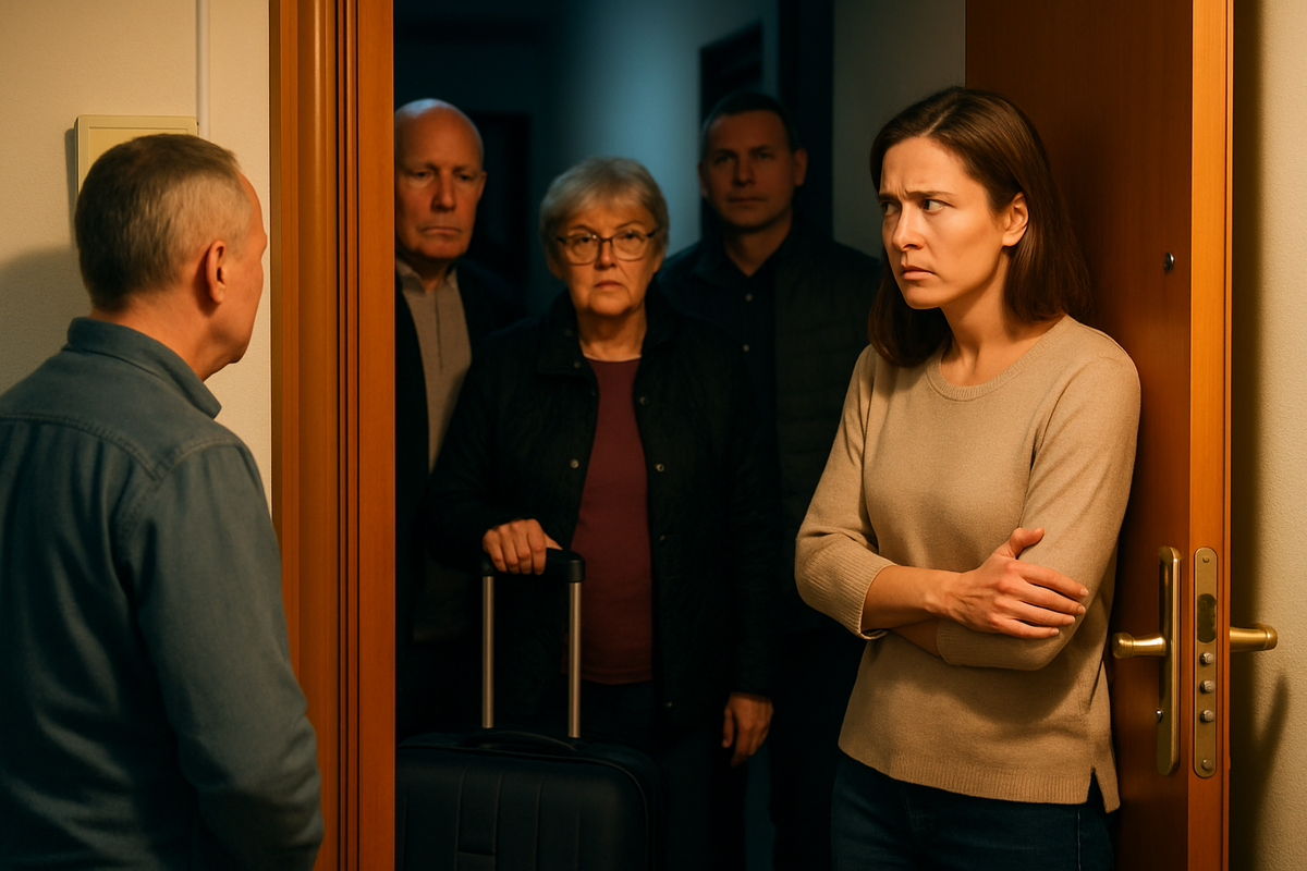 Когда я услышала звонок в дверь, было уже почти восемь вечера. Я никого не ждала. Муж был в душе, телефон лежал на кухне, в квартире стояла привычная тишина. Я открыла дверь - и на пороге увидела людей с чемоданами. Свёкор, свекровь и ещё двое родственников. Все с дорожными сумками, пакетами и выражением полной уверенности, что их здесь ждали.