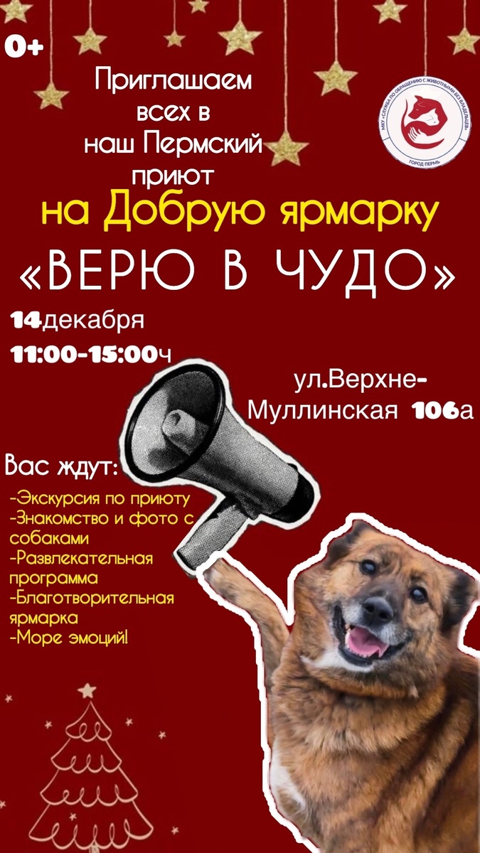 🐶погладить ласковых пёсиков; 🐾погулять по приюту; 🧑🏼🦰пообщаться с волонтёрами; 🎁пошопиться на ярмарке; 📸пофотографироваться с весёлыми хвостиками; 💬проконсультироваться с кинологом; ✨помочь тем, кто в этом очень нуждается. Ваше присутствие — уже подарок для наших подопечных!🐶 Дата: 14 декабря (воскресенье) Время: 11:00-15:00. 📍ул.Верхне-Муллинская 106а (15 мин. от ост.Верхние Муллы)🎄 Там вас будут ждать не только ❄экскурсия по приюту ❄новогодняя лотерея ❄благотворительная ярмарка ❄детская викторина ❄фотограф ❄ советы кинолога ❄ и вкусное чаепитие Мы с хвостиками будем вас ждать!🩷 🎄Добрая ярмарка «Верю в чудо» Чем можно помочь животным приюта и что привезти в подарок? 1. Любые сухие и влажные корма для взрослых собак и щенков. 2. Для кошек и котят сухие корма ПроПлан, Роял Канин или другие премиум-класса. 3. Брезентовые ошейники шириной 20 и 25м 4. Курица (можно суповые наборы без трубчатых костей), говядина (обрезь, ливер, мясные косточки), ливерную колбасу для табл