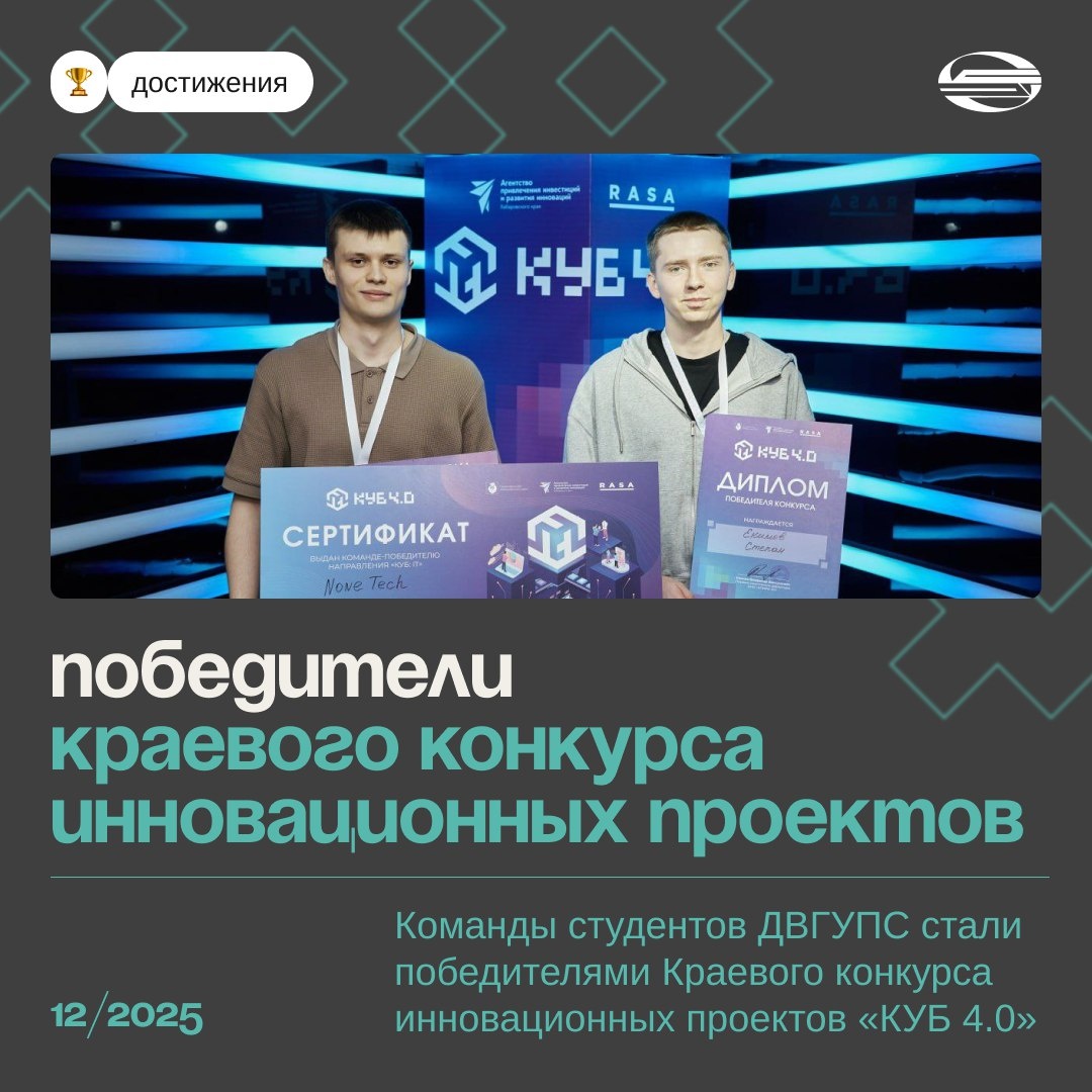 Начнем ваше воскресение с отличных новостей🎞️ Команды ДВГУПС стали абсолютными победителями краевого конкурса инновационных проектов «КУБ 4.0»! 🎞️🎞️🎞️🎞️🎞️🎞️🎞️🎞️ В Хабаровске завершился ежегодный краевой конкурс молодежных инновационных проектов «КУБ 2025». Участниками стали команды молодых специалистов в возрасте от 18 до 35 лет. В рамках конкурса необходимо было решать реальные производственные задачи предприятий региона в двух направлениях: IT и инжиниринг. Участие приняли 15 команд из ДВГУПС, две из которых одержали победу в направлениях конкурса: 🎞️«Инжиниринг»: команда «Хозяйство связи» предложила лучшее решение кейса «Мониторинг Дизель-Генераторных Установок (ДГУ)». 🎞️ «IT»: команда NoneTech разработала кейс интерактивной карты наружной рекламы. Команды получили гранты на разработку решений в размере 150 000 рублей. Организатором конкурса выступил АНО "Агентство привлечения инвестиций и развития инноваций Хабаровского края" при поддержке Правительства Хабаровского