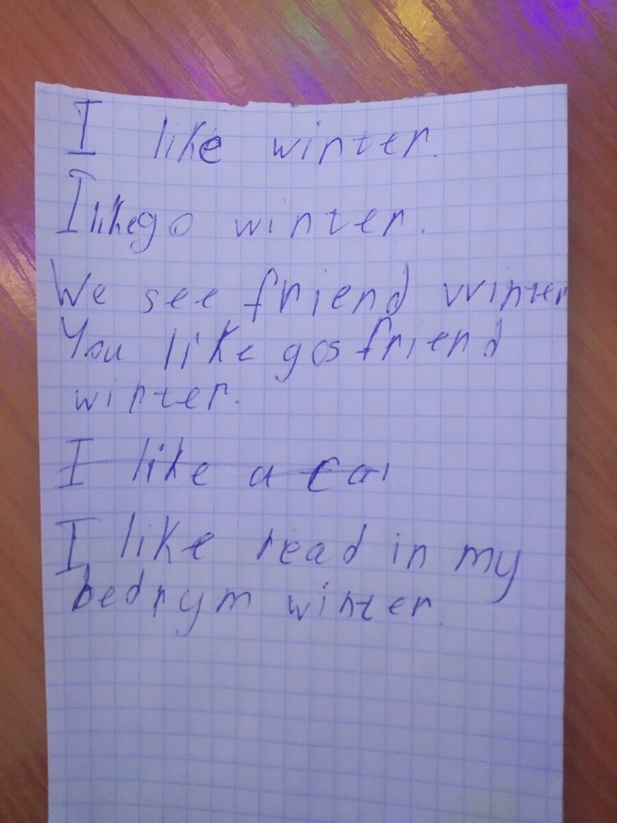 Это пятиклассница, о которой шла речь в утренней статье. Занимается она с моей сестрой, Ведьмой Анафемовной. А та практикует такой вид работы: если до конца урока осталось чуть-чуть времени, она просит написать небольшое количество слов или словосочетаний на какую-либо тему. В частности, она попросила девочку написать о зиме. Все, что придет в голову. Все, что с зимой связано: белый, снеговик, не хожу в школу... То есть она вообще не ограничивает особо. Девочка предъявляет вот. То ли она рассказ попыталась составить на тему: что я делаю зимой, то ли набор предложений, где обязательно есть слово «зима» (может, она так задание поняла: не все, что связано, а чтобы была «зима»). Ведьма Анафемовна пытается выяснить, а девочка смотрит пустым взглядом и отвечает классическое: «Анезнай». А тут и занятие закончилось. И у девочки сразу взгляд оживился: – Я перед уроком около вас начала снеговика делать, сейчас пойду и доделаю. Ведьма Анафемовна ей (не менее радостно и оживленно): – И прекрасно
