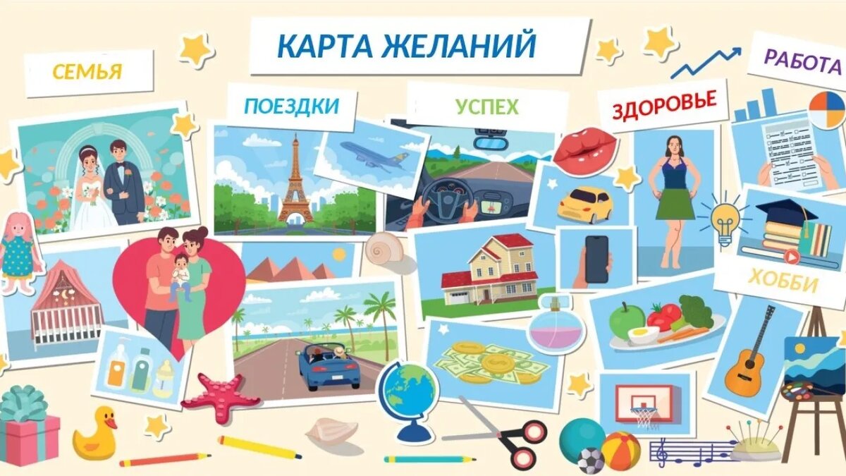 Всем по привету! Приближается новый год! А значит время обновить карту желаний! У вас есть карта желаний? Или вы вообще не знаете, что это такое? Карта желаний — отличный инструмент для визуализации целей и вдохновения. Многие рекомендуют не менять карту пока не исполнятся все мечты, а я считаю, что каждый год ее надо пересматривать. Почему? Просто потому, что со временем ваши приоритеты могут измениться. Некоторые предпочитают сохранять старую карту желаний, просто пересмотреть ее, удалить то что не актуально и добавить новые цели и мечты. Есть мнение, что обновленная карта поможет вам сохранять мотивацию и фокусироваться на актуальных задачах. Еще есть мнение, что надо оставлять карту желаний потому что даже если некоторые желания уже не соответствуют вашим текущим целям, карта все равно может служить напоминанием о том, чего вы достигли или о мечтах, которые вдохновляли вас ранее. Используйте ее как источник позитива и мотивации. И если вы разделяете эти мнения и они вам откликают