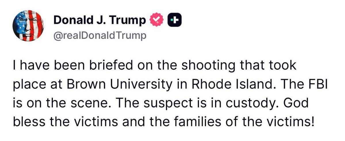 В ответ на пост Trump says Brown University shooting suspect in CUSTODY
