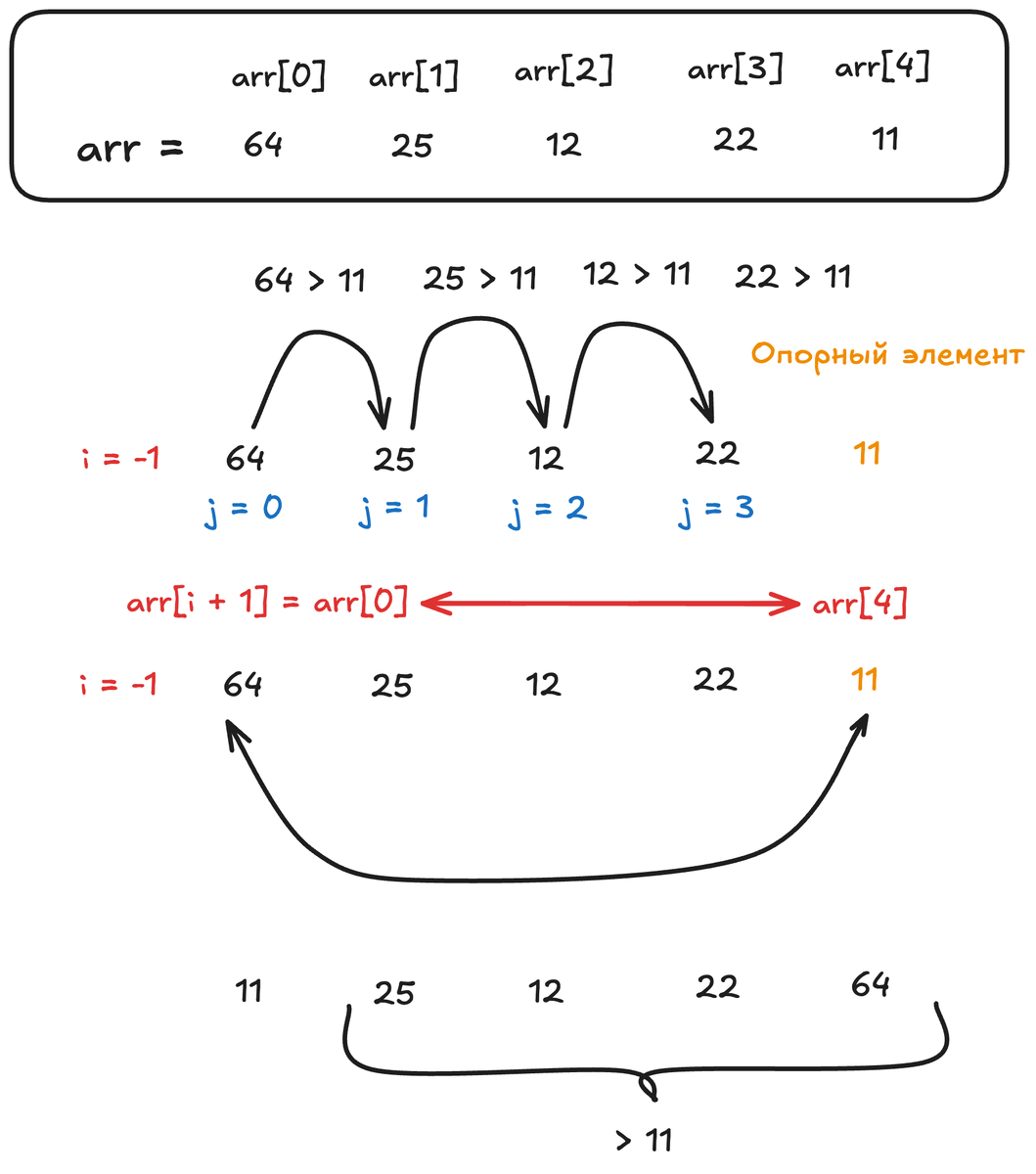 j прошёл все элементы перед pivot. Ни одного элемента меньше 11 не нашлось. Значит, i так и остался -1. Теперь меняем arr[i+1] (то есть arr[0], число 64) с pivotом (11). Получаем массив: [11, 25, 12, 22, 64].