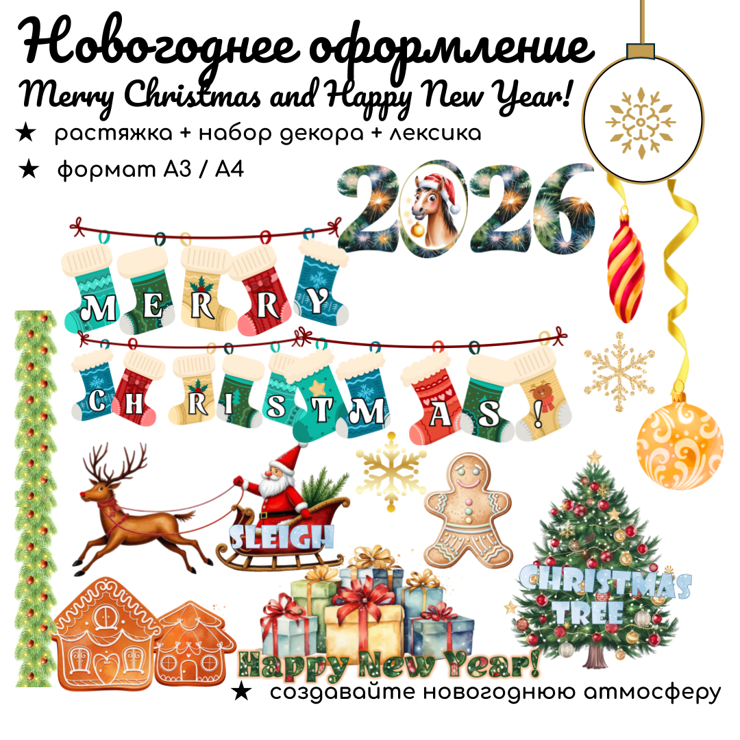 Изучение английского языка связано и с изучением традиций страны, а одним из главных традиционных праздников англоязычного мира является праздник Рождества, отмечаемый 25 декабря. Украсить класс английского языка в новогодне-рождественском стиле и добавить игровой момент для учащихся можно с данным оформлением к Рождеству и Новому году. Игровой момент заключается в том, что в набор входят таблички с лексикой, которые учащиеся могут прикреплять к новогоднему декору. В набор входят: растяжка "Merry Christmas"; плакат с подарками и надписью "Happy New Year"; декоративные элементы: Санта Клаус в упряжке, имбирные пряники в форме человечка и домиков, новогодняя ёлка, цифры 2026 с символом года, снежинки, шарики и подвесы, новогодняя гирлянда. надписи с лексикой: sleigh, Santa, ornaments, gingerbread man, gingerbread house, tinsel, snowflake, Christmas tree, presents. Декоративные элементы можно вырезать по контуру или же в произвольной форме вокруг изображения в стиле стикера. Создавайте
