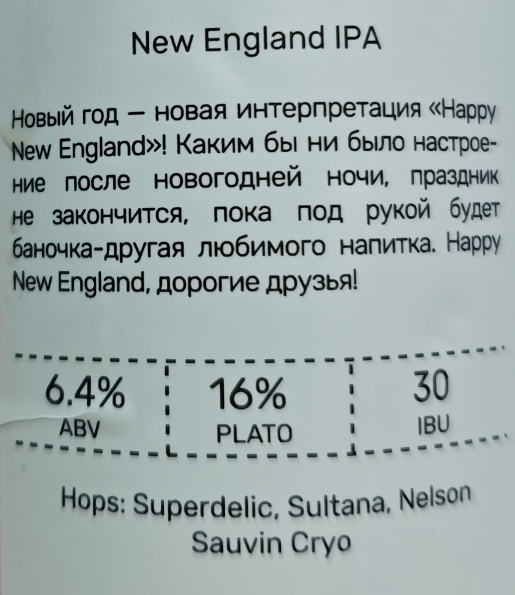 IPA в стиле New England на хмеле Superdelic, Sultana и Nelson Sauvin Cryo. Этот IPA, как и многие другие напитки от White Stone Brewery, традиционно сварен на мощностях ООО "Боярин и Ко" в городе Лыткарино. Описание можно прочитать прямо на этикетке: Там же на этикетке традиционно можно встретить два разных значения крепости: 6.4% и 6%. ********************************************************************************** Плотность: 16%. Горечь: 30. Состав: вода подготовленная, солод пивоваренный ячменный, солод пивоваренный пшеничный, овёс, лактоза, декстроза, хмель, дрожжи пивные. Срок годности: 365 суток при температуре от 0℃ до +4℃. С даты розлива моей банки прошёл 1 месяц. ********************************************************************************** Пены чуть; растворяется бодро, но не до конца. Ароматика не очень сильная, но вполне интенсивная: цитрусы, крыжовник, смородина, виноград и немного хвои. Карбонизация чуть ниже среднего. Во вкусе всё та же мешанина вкусовых оттенков