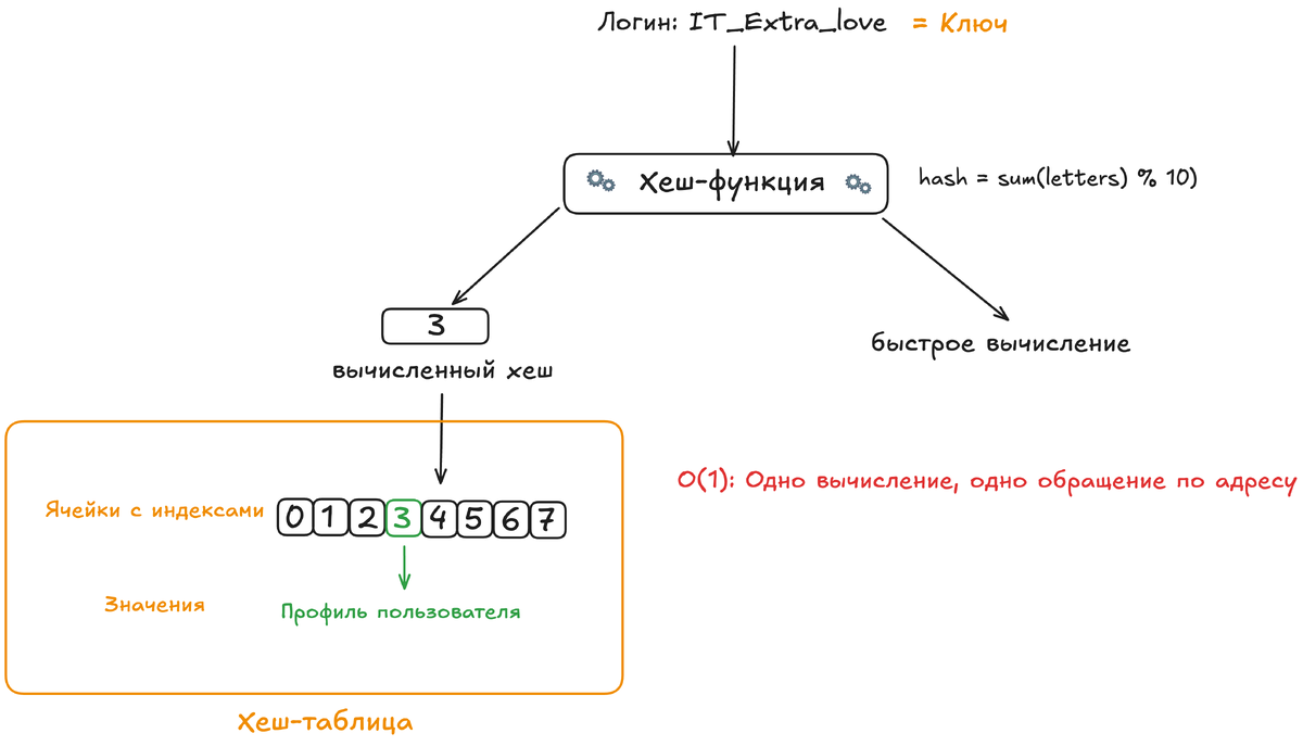 Идеальная картина: для каждого уникального ключа хеш-функция выдаёт уникальный индекс. Кинул в аппарат логин «super_cat_2025» — получил индекс 42. Пошёл к 42-й ячейке массива, а там уже лежит готовый профиль. Поиск, вставка и удаление выполняются за время вычисления хеш-функции (очень быстрое) и одного обращения к массиву по индексу (мгновенное). Это и есть заветное O(1) — постоянное время, не зависящее от n.