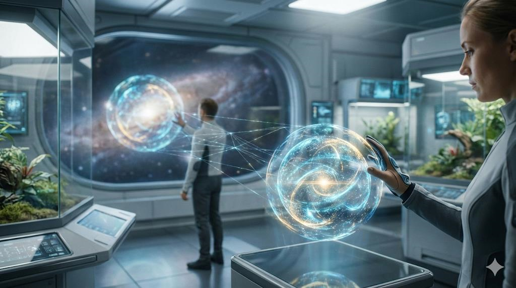 Если волновая функция всей системы «Алиса + Боб» предписывает, что их спины противоположны, она гарантирует эту корреляцию. В тот момент, когда Алиса проводит измерение, она заставляет волновую функцию коллапсировать, и это мгновенно фиксирует состояние для Боба, потому что их части были неразрывно сплетены изначально. Пространство и расстояние для этой фундаментальной связи не имеют значения, так как они существуют как единое целое в абстрактном пространстве возможностей. Мы воспринимаем только «проекцию» этой реальности в нашем трехмерном мире.
