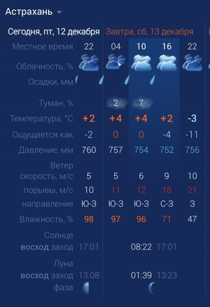 Завтра, 13 декабря, вплоть до 15 декабря текущего года, на территории Астраханской области ожидается резкое изменение погодных условий. Причина – вторжение холодных воздушных масс и прохождение контрастных атмосферных фронтов. Утром температура воздуха поднимется до +4 градусов, днем упадет до +2. Ночью температура может опуститься до ‑11 градусов. В отдельных районах: отложение мокрого снега на проводах и деревьях, гололед, днем метель. Ветер северо-западный 13–14 декабря 16–21 м/с, вечером и до конца суток 13 декабря, ночью и утром 14 декабря местами порывы до 28 метров в секунду. Сообщение Сильный снег, ураганный ветер и ливень: какая погода ждет астраханцев 13 декабря? появились сначала на Астрахань.Ру последние новости региона.