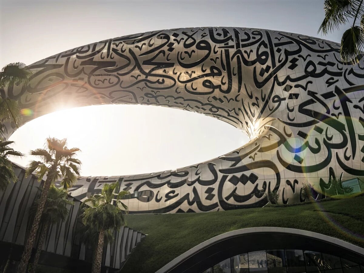 Второй день начал с Музея Будущего — овальное здание с арабской каллиграфией на фасадах, похожее на космический корабль. Билет стоит 45 долларов (159 AED), есть опция Pioneer Pass за 110 долларов — проходишь без очереди и получаешь сувенир. Музей работает с 9:30 до 20:00, советую закладывать 2-3 часа.