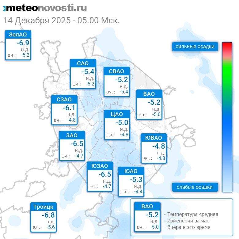 В 5:00 в Москве было от -7.5°C до -4.6°C, средняя температура -5.6°C #погода #Москва #зима #температура #14декабря #воскресенье Перейти на сайт Прогноз погоды на 14 дней