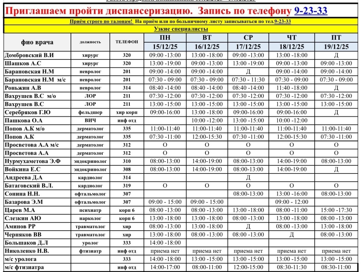 График работы врачей с 15 декабря Возможны изменения. Уточняйте расписание на официальных ресурсах или по телефону кол-центра: 9-23-33. 👉 Подписаться на Макс