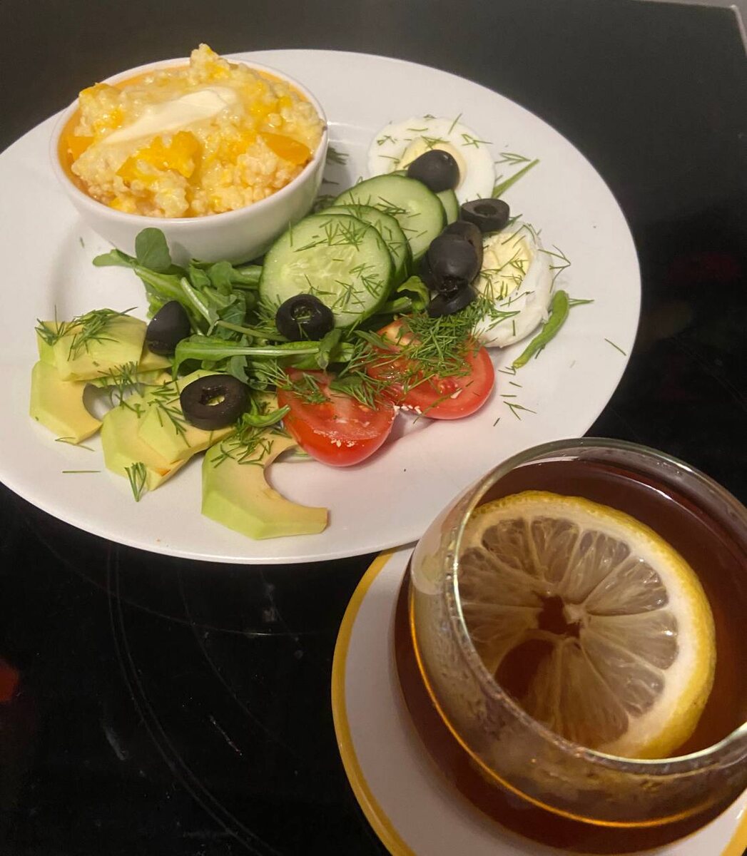 Мой вкусный завтрак. 🥣Каша пшенная с тыквой 🥚Яйцо вареное 🥒Овощи 👍194 ккал