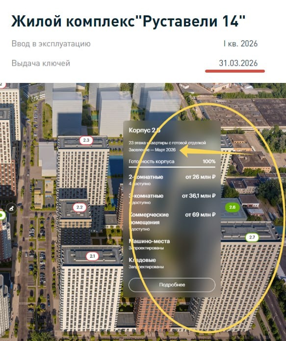 ПИК опять по-тихому переписал сроки ключей в корпусах 2,5-2,8 Руставели 14... Теперь рисуют до 31.03.2026 Напомню, изначально обещали до конца 06.2025. Потом прилепили +3 мес, до конца 09.2025. Затем, спс продлению моратория на штрафняк застроям - натянули до конца 2025. И вот - ловите март 2026 👆 Итого, кому-то добавилось уже 9 мес. ожидания Да, цепочка сея в Русте, коснулась не всех. Половина покупантов 2-ой очереди (к.2.1-2.4) таки щас новоселятся. А вот другой половине (к.2.5-2.8) - пока остаётся негодовать в чатах. И хотя, по планам, мораторий на 2026-ой не продлят... исполнение судебных решений за срыв сроков, застроям, вероятно, позволят оттянуть до начала 2027 Вангую, что утомлённый ПИК-врушками дольщик, в 2026-ом массово пойдёт судится за просрочку. Расчёт неустоя пойдёт от ещё вполне высокого ключа ЦБ. Квартир в зависших корпусах 1330 шт. Всё продано считай в ноль (по срокам ключей в 2025-ом). Поэтому, если таки по ним отдадут ключи в марте, то в зависимости от цены ДДУ,