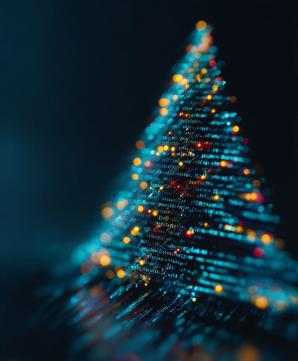 Lines of programming code forming a Christmas tree, with points of light representing LEDs, on a bright, well-lit background with a technological style. --chaos 10 --ar 5:6 --profile ix84zud --stylize 300 --draft #Нейросолнце@neo_neurosun #Midjorney