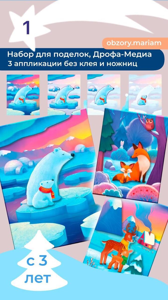 Новогодние наборы для творчества на разный возраст☃️🎄🧸: 1. Объёмная аппликация трёх картин, 253₽, рейтинг на WB 5.0 - https://www.wildberries.ru/catalog/256601224/detail.aspx?size=399756378 От производителя 4+, но делать их очень и очень просто, можно с 2-3 лет. Все детали для поделки из плотного картона уже вырезаны. Остается лишь приклеить их в нужное место на двухсторонние клейкие квадратики, предварительно сняв их с защитного слоя (здесь самым маленьким творцам возможно потребуется помощь). 2. Набор для поделок. Новогодняя елка, 3+, 339₽, рейтинг на WB 5.0 - https://www.wildberries.ru/catalog/177997511/detail.aspx?size=294683096 Всё, что нужно - выбрать самоклеящуюся деталь из ЭВА и прикрепить её на собранную основу. Для ребёнка радость - украсить свою собственную ёлочку самому. В тоже время такое простое занятие весьма полезно - ребёнку нужно распределить игрушки более-менее равномерно в разных плоскостях. Такие ёлочки есть у разных производителей, эта понравилась тем, что зд