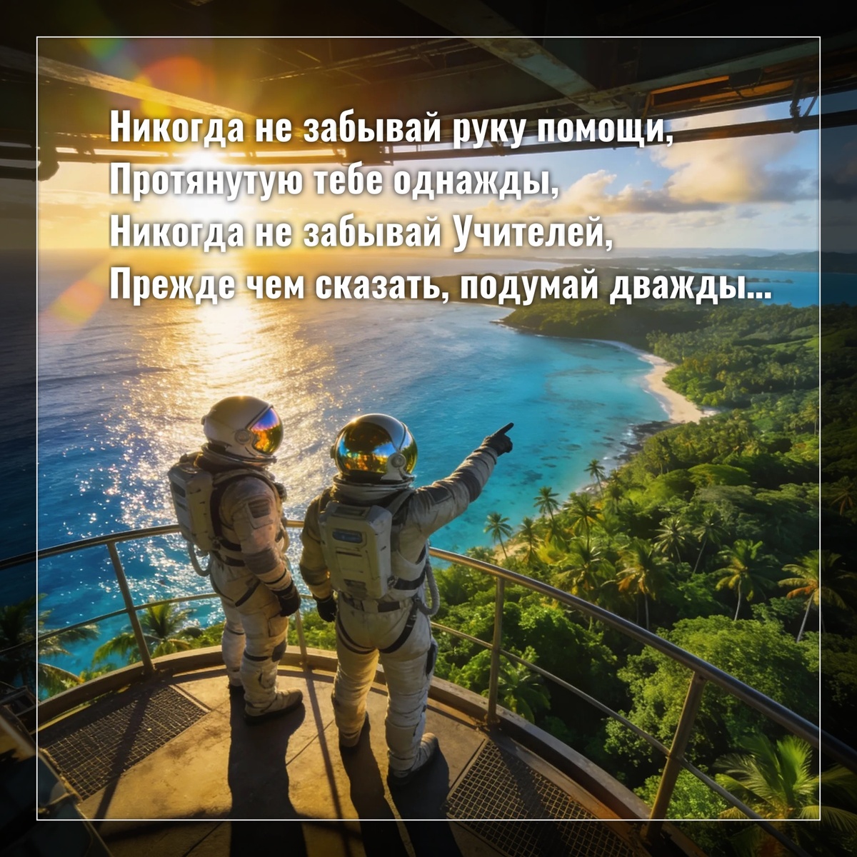 Никогда не забывай руку помощи, Протянутую тебе однажды, Никогда не забывай Учителей, Прежде чем сказать, подумай дважды, Почему и где сейчас ты оказался, Кто тебя когда-то научил Подниматься там, где ты упал, Кого о помощи ты попросил, Не забудь про благодарность и про долг, Что несешь с собой, пройдя преграды, Те, кто рядом был и кто помог, Кто победам твоим были рады, Не забудь, кто дал тебе надежду, Там, где все когда-то отвернулись, Не забудь родных и близких, Кто когда-то, как и ты, проснулись И ни в чём тебя не упрекали, Осуждение в этой жизни убирай, Вспомни каждого, кто здесь тебе помог, Добрые сердца не забывай, Не старайся выглядеть умнее, Чем твои враги и «педагоги», Помни всё равно ведут к одной Единственной на свете все дороги, Все там встретятся и смогут посмотреть На жизнь свою совсем иначе, Все увидят подлость и любовь, Как проверки в жизни много значат, Как менялись лица и поступки, Как тебя спасли и как распяли, Но, пожалуйста, не забывай, Тех, кто руку тебе свою д