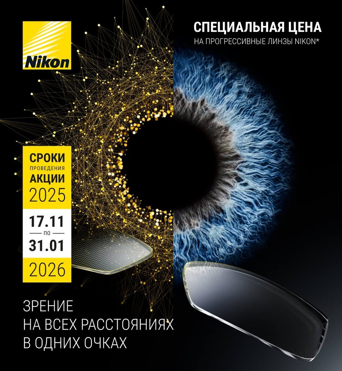 Специальная акция на прогрессивные линзы Nikon С 17 ноября 2025 года по 31 января 2026 года в нашей оптике действует специальная цена на прогрессивные линзы Nikon. Прогрессивные линзы - это комфортное зрение на всех расстояниях в одних очках: ✔ для дали ✔ для компьютера ✔ для чтения Без необходимости постоянно менять очки и с максимально плавной адаптацией. Линзы Nikon — это японская точность, современные технологии и высокий уровень визуального комфорта в повседневной жизни. Сроки акции: 17.11.2025 — 31.01.2026 Рекомендуем не откладывать: предложение ограничено по времени Ждём вас!