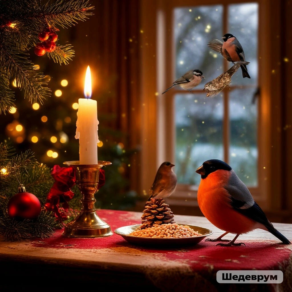 Горят рождественские свечи И в зале ëлочка горит, А к нам сегодня в этот вечер Вдруг прилетели снегири. Кормушка в спальне на окошке, Подсыпим семечек чуток, И прилетят они к кормушке, Чтобы поесть ещё разок. Снегирь заманчивая птица, Мы наблюдаем день за днём И прилетит ещё синица Сверкая грудкой как огнём. Ребятам нравится природа, Гулять и в парке и в лесу, Увидеть белку и енота, Найти красивую лису. Тайга богата соболями, Лосями, уткой, кабаргой, Давай останемся друзьями Увидев зайца под сосной. Автор Антон Власов.