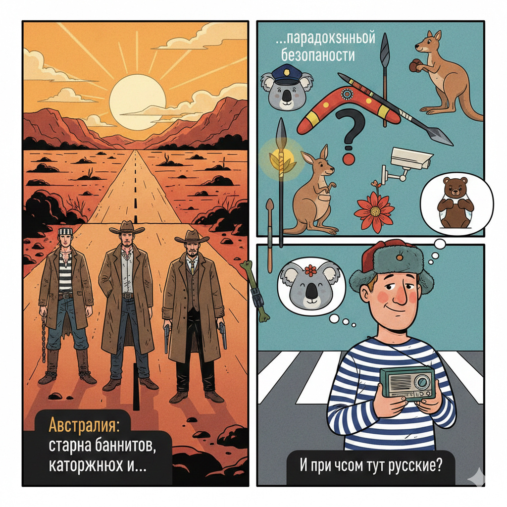 Австралия — это место, где тебе улыбаются люди с лицами, будто они вчера грабили банк, где полиция вежливая, как библиотекарь, а самый страшный преступник — это чайка, которая украла твой сэндвич. И да, это страна, построенная уголовниками. Но при этом одна из самых безопасных на планете. Как так вышло? И почему русские тут чувствуют себя почти как дома, но без постоянного ожидания подвоха? Начнём с неловкого факта, который австралийцы не любят, но знают Австралия — это исправительная колония, ставшая государством. Сюда свозили: — воров — убийц — должников — фальшивомонетчиков — и просто тех, кто не понравился Британской короне По сути, это был гигантский эксперимент: что будет, если выгрузить криминал на край света и сказать: «Ну, как-то живите». Ответ: они построили нормальную страну. Без пафоса. Без идеологии. Просто чтобы выжить. Диалог, который многое объясняет — «У вас так спокойно. Почему?» — «Да мы все знаем, что каждый может быть опасным» — «И?» — «И поэтому