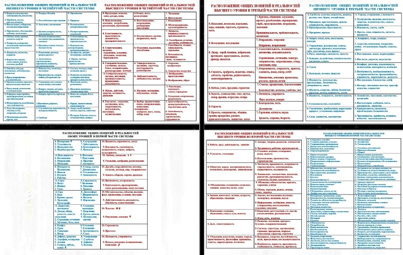 4. Самые высокоразвитые общие реальности из правых рядов четвёртой части системы антагонистичны самым слаборазвитым общим реальностям из второй части системы. Менее развитые общие реальности из левых рядов четвёртой части системы антагонистичны самым развитым общим реальностям из второй части системы. Направление развития в группах высокоразвитых общих реальностей четвёртой части системы направлено слева направо, то есть справа находятся самые высокоразвитые общие реальности. Примеры антагонизмов между высокоразвитыми реальностями из четвёртой части системы и слаборазвитыми реальностями из второй части системы. Резерв, продукция, изделия – экономика, хозяйство, технологии. Человек – техника, механизмы. Отдых, развлечения, досуг – нагрузки, тренировки, упражнения. Восстановление, регенерация – износ, порча, повреждения, разрушения. Использование, потребление, применение – инвестиции, снабжение, обеспечение. Возвышение, облагораживание – переработка, обслуживание, исправление. Практичность, деловитость – расходы, оплата, подарки, аренда. Индивидуальность, оригинальность, своеобразие – отходы, отбросы, потери, отсутствие. Коллективизм, патриотизм, группа – множество, пространство, космос, бесконечность. Отделение, выделение, обособление – кооперация, взаимодействие, взаимосвязь. Бережливость, экономия, наличие – условность, искусственность, игра, симуляция. Способности, талант, возможности, потенциал – тождество, копии, подобия, типичность. Универсальность, кругозор, эрудиция, разнообразие – память, схема, запись. Совершенствование, улучшение, модернизация – обоснование, логика, математика. Открытие, изобретение, творчество - обозначение, определение, расчёт, учёт. Любознательность, интерес – стандарт, эталон, шаблон, измерения, сравнения. Сообразительность, догадка, интуиция, предвидение – классификация, проверка, инспекция. Воображение, представление, образ – наблюдение, созерцание, слежка. Выбор, экспромт, импровизация - фанатизм, догматизм, детерминизм, предопределение. Жизнь, активность, движение – бюрократизм, педантизм, правила, законы. Революции, скачок, ускорение – повторение, традиции, регресс, деградация, торможение, остановка. Желание, намерение, мотив – обязанность, потребность, необходимость, неизбежность. Результат, следствие, достижение, итог, современность – нейтральность, сдержанность, равнодушие. Целеустремлённость, цель, перспектива, увлечённость – пассив, сон, неподвижность, паралич.