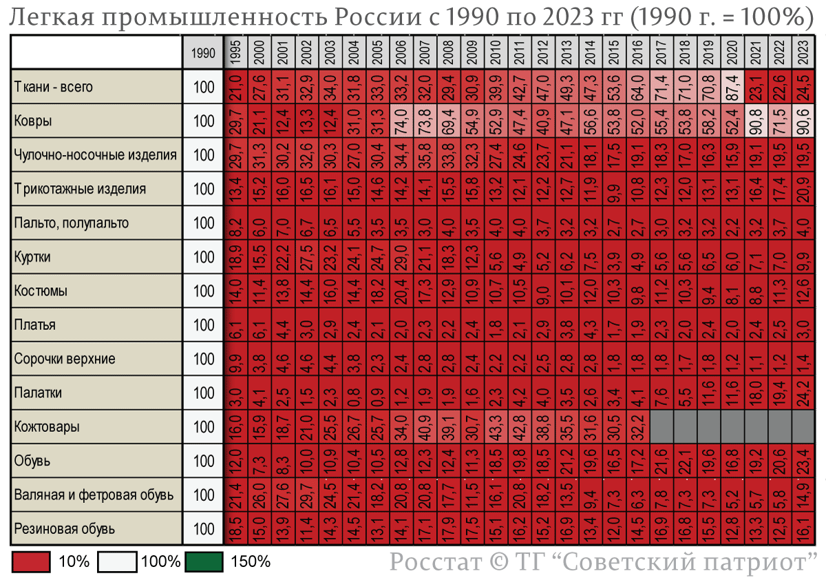 Одно из первых лиц государства озвучил на днях довольно позорные цифры, касающиеся неспособности российской промышленности одеть и обуть россиян в продукцию отечественного производства. "Что же касается гражданской продукции, да, здесь нам надо наращивать объемы и выйти с 15% по текстильной промышленности на 45%", - сказал Володин во время осмотра выставки "Российская легкая промышленность" в Госдуме. Представляете уровень зависимости нашей страны в одежде и обуви! Оказывается, только 1/7 или 1/6 рубашка, портки, галоши и прочее в России отечественного производства. Всё остальное импортное, китайское или еще какое. И это действительно так, если взглянуть на данные официальной статистики, касающейся легкой промышленности России: Падение по большинству позиций просто ужасающее. И это с учетом того, что официальная статистика считает российским производством пошитое за рубежом, но имеющее шильдик "Сделано в России" о чем автор сообщал еще недавно. Зато с рассказами про "неэффективный" Со