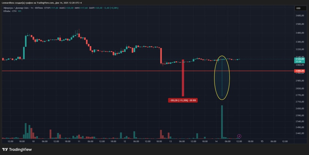 #ETH ❓❓❓ ‼️На бирже Bitfinex довольно интересная ситуация: в паре к USD огромная локальная сопля вниз в зону уровня 2750$ = крайний среднесрочный Low! ❓Зачем и почему?? Самое простое объяснение, что по рынку продан огромный объем ETH, это же видно по индикатору "V", который также мощно был выкуплен! Однако у всего есть своя причина, и в аналогичном случае это вынос стопов перед сильным движением. При чем стопы вынесли на глубину 12%, и это на эфире!! ☄️Второй причиной может быть действительная продажа крупного объема эфира за доллар, не usdt, хотя трудно представить, что на выходных кому-то не хватило денег рассчитаться за ресторан и он решил быстренько продать пачку монет). При этом, данный факт меня настораживает, в плане возможного ретеста данной сопли, хотя общий рынок к usdt чувствует себя спокойно!! P.s. в моей практике ранее бывали случаи, когда именно предварительные отдельные движения графиков ключевых активов к чистому баксу, указывали дальнейшее направление движения цены