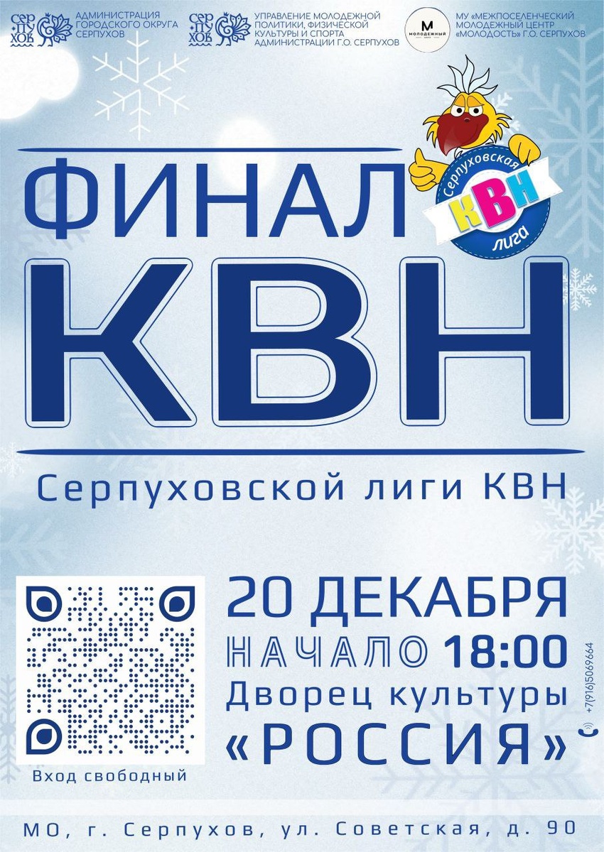 ✨ Финал КВН В финале встретятся 5 команд ▪️ "Без денег" Ступино, ▪️"Стратеги" Серпухов, ▪️ "Лесная братва" Пушкино, ▪️ "Жиза" Серпухов, ▪️ "Клёцки" Болеем за команды ✅ 🚫 Возраст: 14+ 📆 20.12.2025 🕒 18:00 🏢 Дворец культуры «Россия» 📍 г. Серпухов, ул. Советская, д. 90 💰 Вход свободный❗️ ⭐Поддержать канал голосом 💰 Канал Вакансии Серпухова ✅ Мероприятия Серпухов https://dzen.ru/id/66f01c6eb4c6fe60c9ca1608 http://vk.com/serpukhov_events http://dzen.ru/serpukhov_events