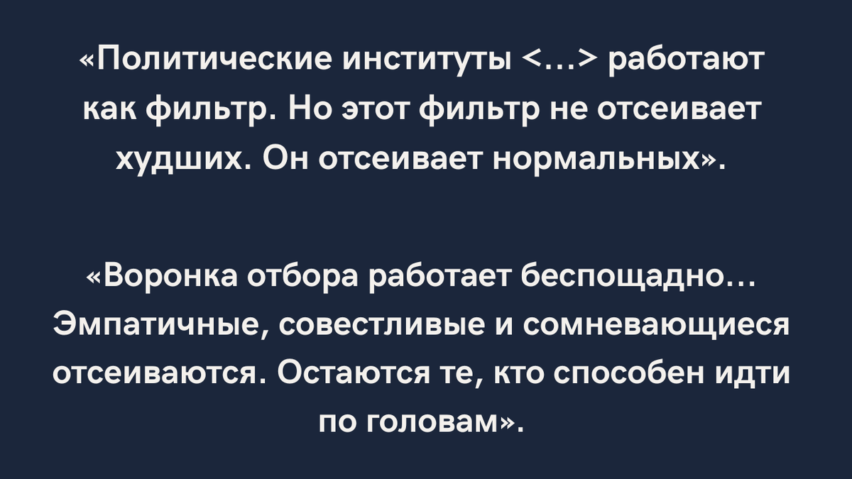 К 2010-м годам в политической психологии сформировалась эволюционная гипотеза, которая звучит как приговор современной демократии. Политические институты — с их размытыми моральными правилами, жесточайшей конкуренцией и необходимостью нравиться толпе — работают как фильтр. Но этот фильтр не отсеивает худших. Он отсеивает нормальных.