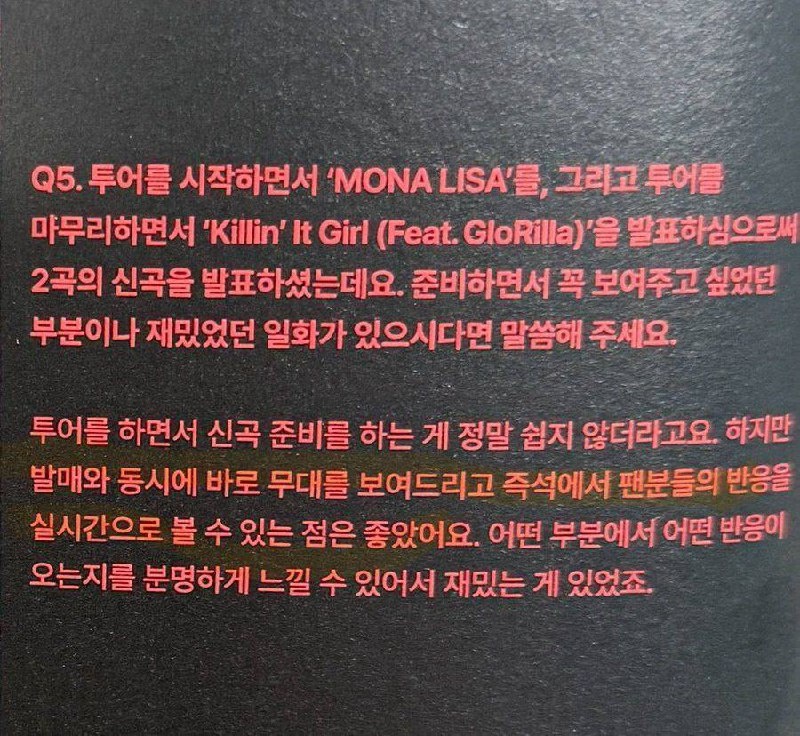 🍊 [Сканы] Интервью из фотобука "J-Hope Tour "Hope On The Stage" The Original": В5: В начале вы выпустили "Mona Lisa", а в конце "Killin' It Girl". Есть ли часть, которую вы хотели бы показать, или какая-нибудь забавная история, которая произошла с вами во время их подготовки? Хоби: Правда в том, что готовить новые песни во время тура было очень тяжело. Однако было хорошо иметь возможность показать их на сцене сразу после выпуска и видеть реакции фанатов в реальном времени на месте. Было забавно чётко чувствовать, в какой части они реагировали каким образом. В6: Во время концерта вы сказали: "Джей-Хоуп становится завершённым со всеми вами". Что представляют собой Арми для Джей-Хоупа? Хоби: Я думаю, что теперь мы — это отношения, в которых мы даём и получаем влияние, просто существуя друг для друга. Если кто-то — цветок, другой — вода, которая заставляет его цвести; и если кто-то — живое существо, которое дышит, другой — кислород, который поддерживает это существо живым. Если я "J",