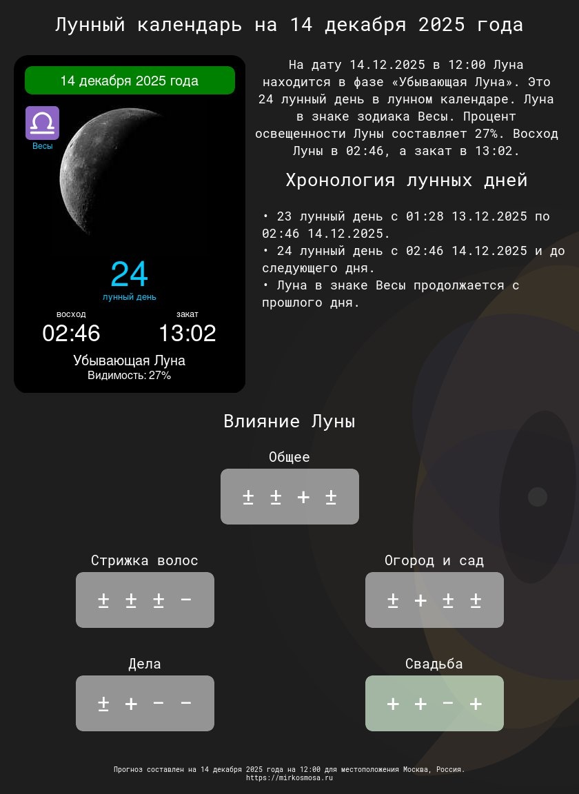 Лунные календари на 14 декабря 2025 года: Подготовьтесь к этому дню с учетом влияния Луны! 🔹🌗 Лунный календарь на 14 декабря 2025 года — Что приготовила Луна? Подробнее 🔹✂️ Лунный календарь стрижек на 14 декабря 2025 года — Подходящий ли день для обновления прически? Подробнее 🔹🌱 Лунный календарь огородника и садовода на 14 декабря 2025 года — Лучшее время для ухода за растениями. Подробнее 🔹📅 Лунный календарь дел на 14 декабря 2025 года — Удачные моменты для важных задач. Подробнее 🔹💍 Лунный календарь свадеб на 14 декабря 2025 года — Подходит ли этот день для вашего торжества? Подробнее