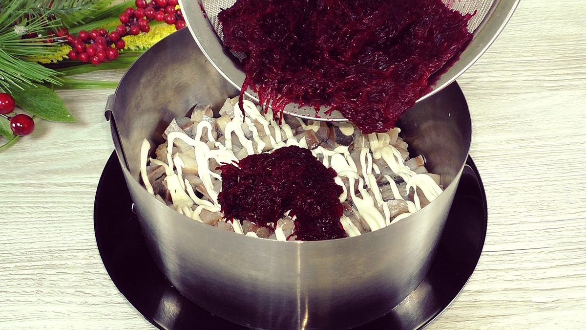 2 слой — отварная и натёртая на мелкой тёрке свёкла. Я свёклу натираю в сито и даю лишнему соку немного стечь. Если свёкла очень сочная, делать это обязательно. Желательно даже немного отжать. На свекольный слой добавляю немного майонеза, опять же ничего не утрамбовываю, слои должны "дышать".