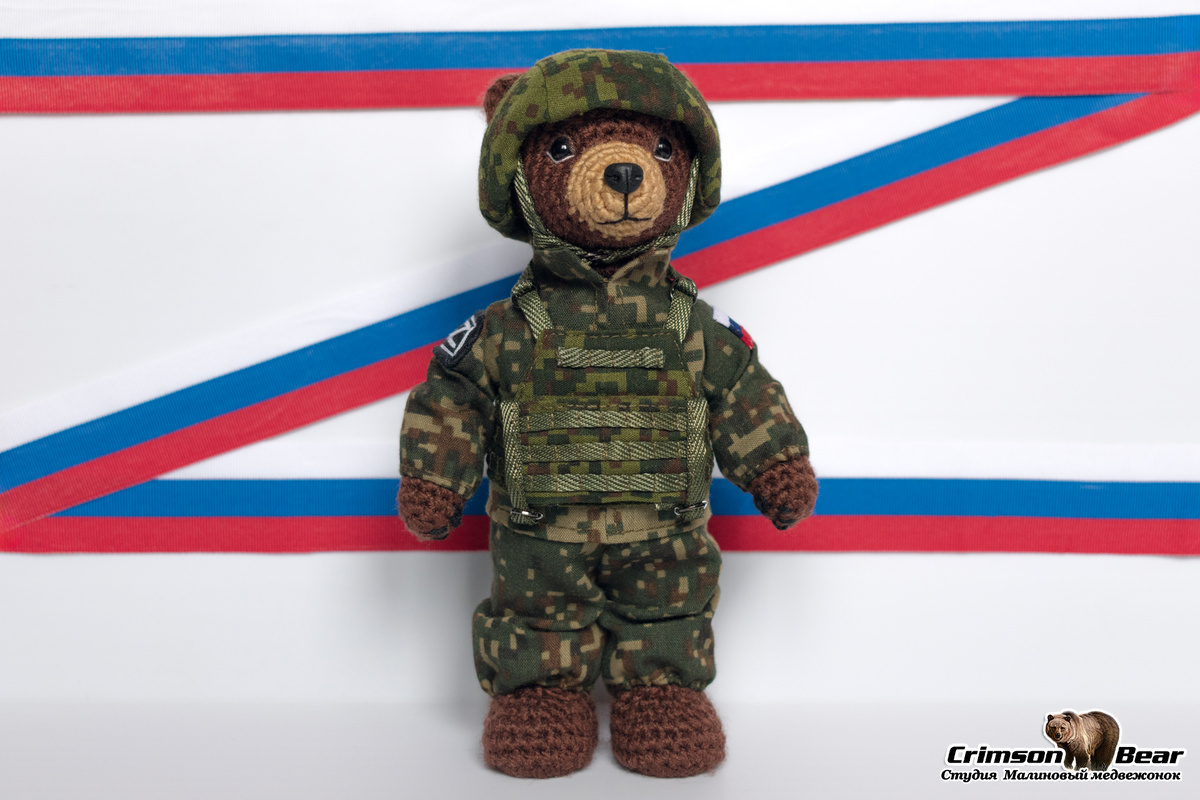 Размер сувенира 15 см. Подвижные лапы на каркасе и голова на шплинтовом креплении. Специальная петелька для подвешивания. Каску и бронежилет можно снимать. Контакты для заказа: Телеграм или во ВКонтакте. Подписывайтесь на канал, чтобы увидеть больше интересных образов.