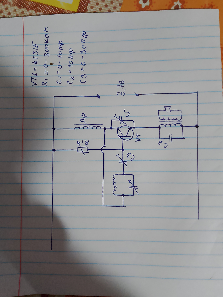 сам приемник является немного переделанной схемой,фм приемника на одном транзисторе.для создания фм приемника на одном транзисторе подходит любой высокочастотный транзистор н-п-н или п-н-п структуры.независимо от мощности транзистора.чем мощнее транзистор,который используется в схеме,тем большее сопротивление надо применить в базовой цепи или меньшее напряжение питания.в данной схеме применил транзистор КТ 315.с любым буквенным индексом.в коллекторной цепи транзистора установлен высокочастотный дроссель.высокочастотный дроссель это 3-15 витков провода.в используемом приемнике,высокочастотный дроссель состоит из 7 витков провода.между эмиттером и коллектором установлена ёмкость,8пикофарад.можно поставить конечно и подстроечный конденсатор,для удобства.далее в эмитерной цепи установлен сетевой трансформато,220-12 вольт.сетевой трансформатор я взял из блока питания антенного усилителя.паралельно первичной высокоомной обмотке трансформатора впаяный конденсатор ёмкостью до 10нф.он необходим