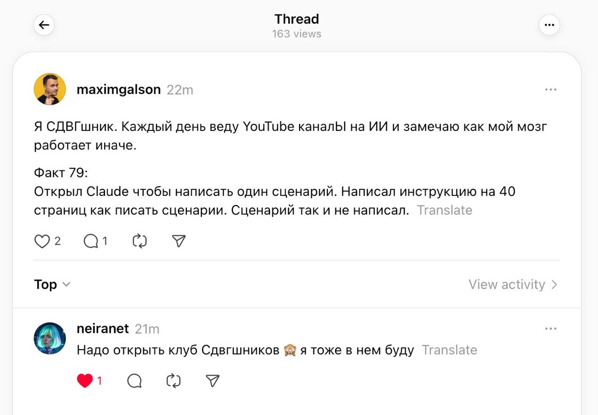Пишу посты в Threads и заметил, что кучу времени трачу на то, чтобы скопировать главную фразу-строчку, потом факт... НЕЭФФЕКТИВНО 😁 Разобрался как называется удобное окно под копирование. Теперь в инструкции буду добавлять – предоставь пост в code block (блок кода) или fenced code block в Markdown. Я сам в Notion всегда большие текста пише в блоке /code потому что удобно потом одним тыком его забирать в работу. Да! Я настолько высокоэффективный ленивый, что cmd+с cmd+v для меня сложнее, чем 1 клик на кнопочку копировать. Оптимизируйте выдачу данных ИИшкой! Когда делаешь за утро 50+ публикаций Threads в 2 канала лишние пару секунд на исправления накидывают дополнительные полчаса работы. P.S. полезный лайфхак – когда заканчивается лимит 25 отложенных публикаций можно сохранять черновики, которые потом переводить в отложку.