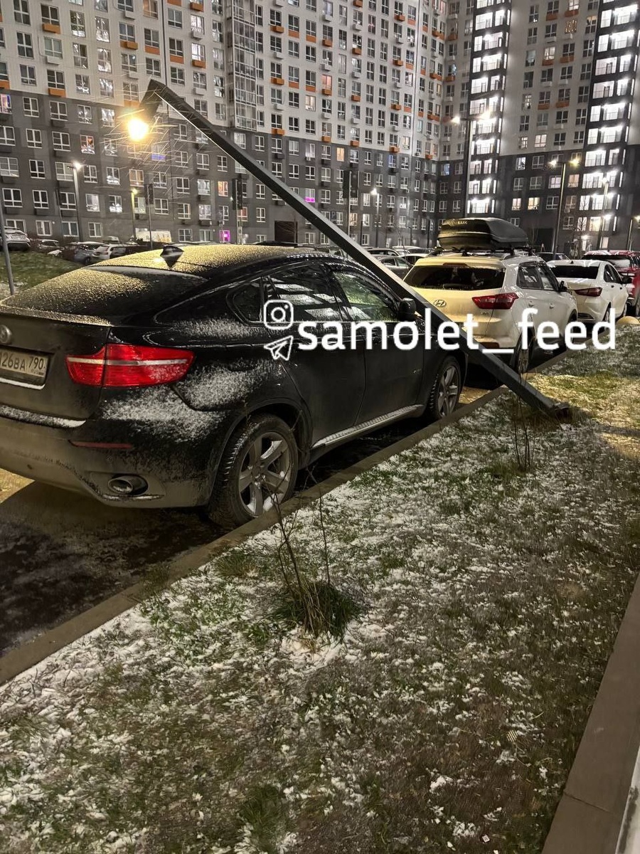 В ЖК "Люберецкий" от сильного ветра фонарный столб упал на припаркованную машину.