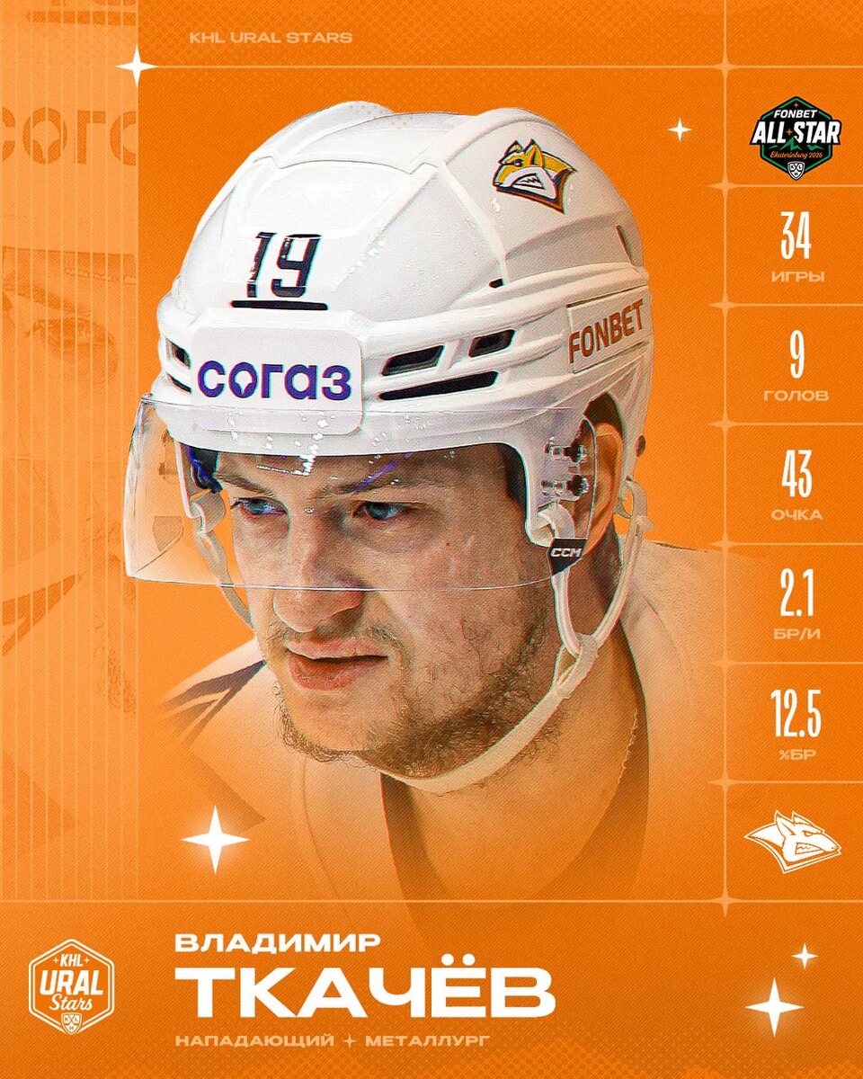 🦊 Екатеринбуржский Фонбет Матч Звёзд КХЛ не обойдётся без мастерства лучшего бомбардира лиги Владимира Ткачёва! 7 и 8 февраля нападающий «Металлурга» проведёт свой четвёртый по счёту звёздный уикэнд в составе команды KHL Ural Stars. ⭐️ Билеты на #KHLAllStar